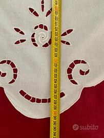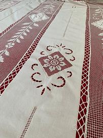 Tenda come nuova dal disegno particolare, alterna una striscia ad uncinetto ad una striscia ricamata ad intaglio. 240x180