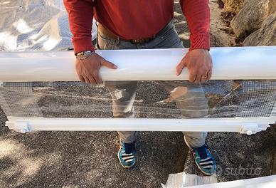 Vendo tenda bianca in pvc trasparete e ai lati quadrettata trasparente come vedi foto.La vendo per errore di misura.