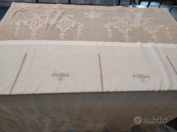 tenda lavorata all' uncinetto a mano, no lavoro industriale ,con inserto centrale in cotone ricamato a mano. Cm L 145 X 170.