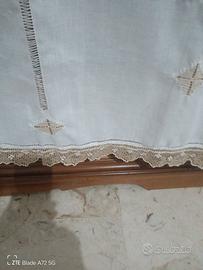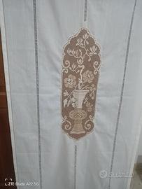 Vendo tenda in lino colore écru con inserti di filet modano e punto a giorno la tenda e composta da un medaglione +4 piccoli quadrati e la frangia misura 80x 1,93 si effettua la spedizione a carico dell' acquirente