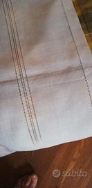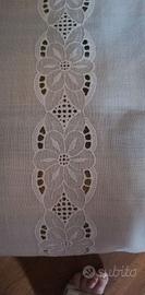 Orlo a giorno, lungo tutto il perimetro e doppio ai lati del ricamo centrale, eseguito a mano. Un grande motivo floreale, ricamato a macchina così sapientemente da sembrare eseguito a mano, si snoda su tutta la lunghezza rendendolo un capo raffinato ed elegantissimo.
