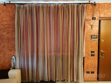 Vendo n.2 tende lungh.240x264 altezza complete di bastone. Descrizione: N.1 tenda di tessuto pesante goffrato rosso scuro N.1 sovratenda leggera mista organza beige e oro N.1 bastone in ferro lungh.270 con decorazioni foglie
