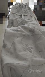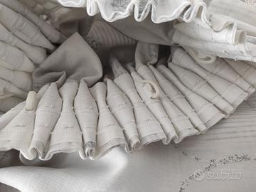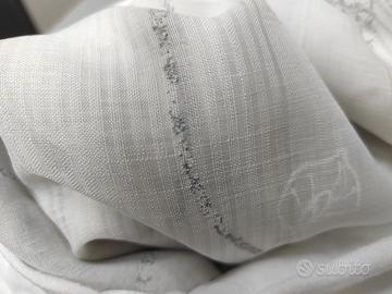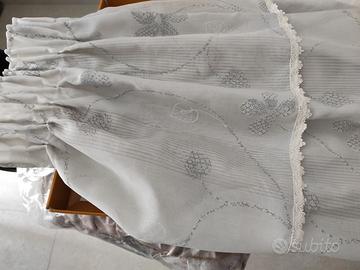 Vendo bellissima tenda per ampia finestra o piccolo balcone. Ottima qualità e manifattura di tappezziere. Colore bianco scuro con disegni grigio chiaro, mantovana integrata rifinita di passamaneria, la fascia ha i ganci per il bastone all'americana. Misure: altezza m 1,95 circa compresa la mantovana che è cm 40 circa, e larghezza ( della finestra non del tessuto ) m 1,17 circa. Naturalmente può essere modificata in base alle esigenze. Vero affare