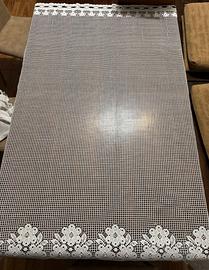 Tenda bianca traforata con disegni floreali sulla base. Pratica perchè non ha bisogno di ganci e può essere spostata agevolmente.