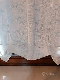 Grande tenda 90x145cm regolabile: la parte sotto si arriccia tramite appositi fili, mentre la larghezza dipende dall'arricciatura (in foto è larga circa 77cm). Colore bianco con fantasia stile foglia azzurro/verde