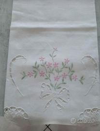 - Dettagli ricamati a mano con fiori rosa e foglie verdi.