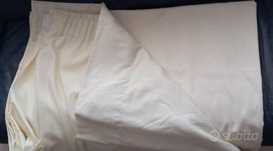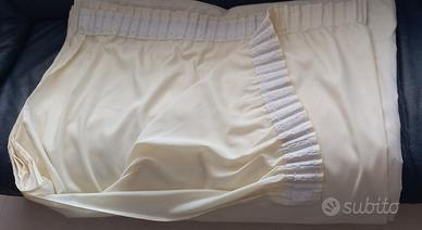 Tenda in cotone e poliestere colore giallo chiaro, rifinitura artigianale con bordi laterali, orlo in fondo e fettuccia cm 6,5 con ganci, pronta per essere appesa. Misure: Larghezza cm 381, Altezza cm 275, Orlo cm 16. La tenda è usata ma ben conservata. Vendo per mancato utilizzo.