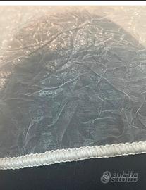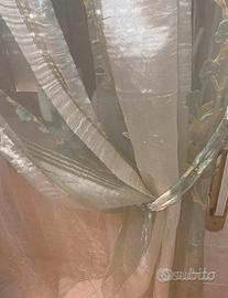 Doppia Tenda di velo : 1 color verde chiaro , con fantasia di fiori bordati color oro ,rifinita con bordo a cordoncino e asole ad occhiello per fissarla sul bastone.