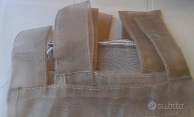 2 tende per soggiorno o camera da letto utilizzate pochissimo. Misura: 137× 265 cm ciascuna. 100% poliestere. Color tortora filltranti.Senza etichette. Passanti superiormente adattabili a parecchi tipi di asta.