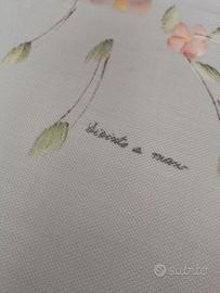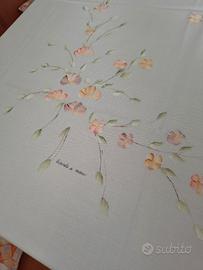 Tenda in cotone con disegno floreale dipinto a mano ( ben visibile nella 3' foto).Su 3 lati rifinitura con piccole cappe. Colore bianco latte. Dimensioni L 156 H 260.