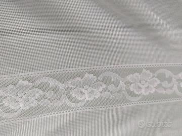 Tendaggio bianco trasparente con decorazioni a fiori, attacco con bottoni automatici, un solo pannello. Misure lunghezza circa 2,60 metri, larghezza iniziale circa 84 centimetri e finale 2,10 metri