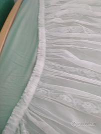 Tendaggio bianco trasparente con decorazioni a fiori, attacco con bottoni automatici, un solo pannello.
