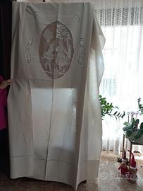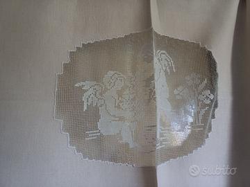 Tende (tre teli) in lino naturale di misure cm 260 (h) x 160 ciascuna ricamate a gigliuccio con intarsi di Amorini a rete abbinabili per vetrata o come singole. Finite con fettuccia. Nuove. Solo ritiro di persona. Euro 80 ciascuna