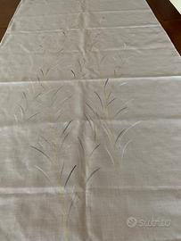 Composte da 7 teli a pannello misto Lino tutti rifiniti in alto con velcro e in basso tutti rifiniti con pizzo fatto a mano. Tutti i teli hanno un disegno molto leggero nei colori e nella forma. Dimensioni: