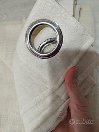 Vendo insieme tenda ad anelli con disegni a cerchio sul marroncino più un telo tenda sul beige chiaro. Le misure sono le classiche tende già confezionate adatte per finestre e porta finestre di un appartamento. Prezzo non trattabile.