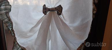 Coppia tende per cucina country, con bordo in verde e arricciature con fiocchetto, insieme a mantovana abbinata. Contattatemi per misure.