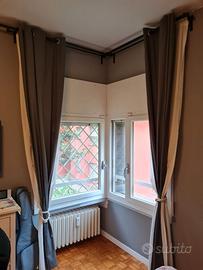 Per la camera da letto: 2 tende con bastone doppio, bianco leggero sotto e grigio coprente sopra.