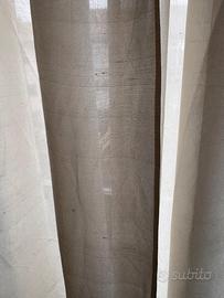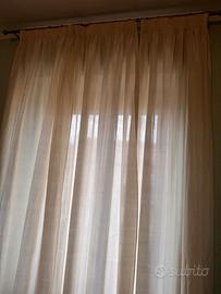 Tende da interni, colore panna, tessuto leggero, non oscurante, altezza 260cm, 3 teli di larghezza nominale 145cm, totale 435cm, li utilizzo per coprire circa 150cm di finestra. Gia finita con fettuccia tende in alto e ganci tenda, e risvoltata sugli altri 3 lati. 3 teli in blocco: singolo telo h260cm L145cm, lunghezza totale 435cm. La tenda è dotata di fettuccina per tende già cucina all'estremità superiore della tenda, e dotata di gancetti (vedi ultime foto). Mentre non sono forniti gli anelli che solitamente fanno parte della dotazione del bastone per tenda.