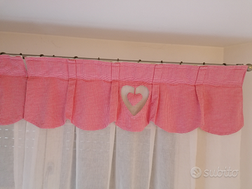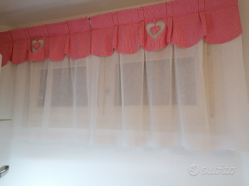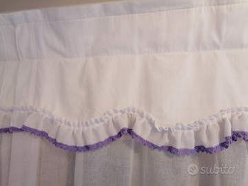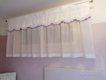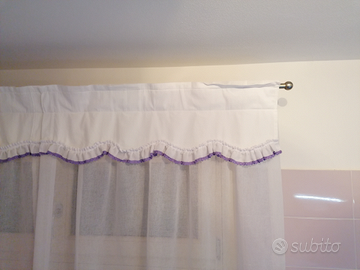 Tende adatte a finestre piccole, h. 92cm, l. 92cm.Il tessuto bianco è NONstiro, la parte superiore è in 100%cotone, tutto lavabile in lavatrice. Una coppia bianco/rosso e una coppia bianco/passamaneria viola. Il prezzo è da intendersi al telo, per cui Euro 30 a coppia. Vendibili anche separatamente. Per tutti e quattro, Euro 50