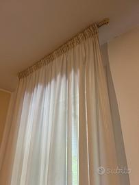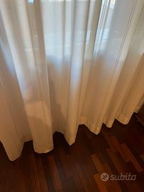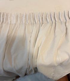 Coppia tende da interno bianche, non bianco candido, tessuto in cotone e poliestere con lavorazione verticale, fondo con ricamo, riloga in alto per arricciatura, appesa tramite gancetti. Lunghezza cm 270 ambedue, larghezza cm. 303 totali e cm. 156 in alto la più grande, larghezza cm. 215 e cm. 116 la più piccola. Lavabili tranquillamente in lavatrice, realizzate a mano su misura. Disponibile per altre foto, vendo anche separatamente.
