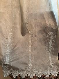 Sulla tenda ci sono dei motivi ricamati tono su tono e l’orlo inferiore è rifinito con una bordatura delicata.