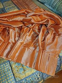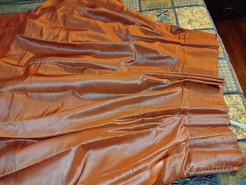 Due tendaggi grandissimi in un tessuto meraviglioso di taffetà di colore bordeaux con un cangiante azzurrino. Una tenda misura 6 metri di larghezza e una 4,50 metri. Entrambe sono alte cm 286. Nella prima foto mostro una terza tenda, che ho modificato e riutilizzato per una camera da letto.