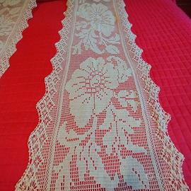 Coppia di tende lavorate a mano a filet con l'uncinetto con cotone bianco di alta qualità.