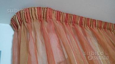 Coppia di tende in organza bicolore a pacchetto (come da foto) misure H 300 cm max, L 200 cm, P 20 cm. Comprensive di aste marca Mottura con terminali angolari curvi e rullo a catenella per l'avvolgimento.