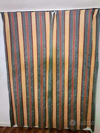 Eleganti tende doppie sartoriali, artigianali, vintage in stile art déco a righe. Multicolore: verde acqua scuro, giallo crema e rosso corallo. Il tessuto broccato - damascato è spesso e setoso, di alta qualità. I motivi geometrici non sono stampati ma intessuti nella stoffa. Attacco con ganci al nastro per arricciare (filo assente).