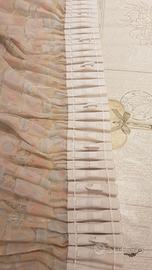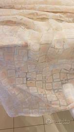 In vendita due teli per chiusura a sipario di un'ampia finestra larga 2,10 metri. Altezza dei due teli 2,20. Cotone bianco trasparente con disegni colorati di rosa. Bel effetto visivo.