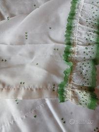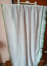 Due tende per porta finestra cuoricini verdi su fondo bianco,festone arricciato su un lato. leggermente ambrata solo un angolo come si vede da ultima foto. si può eliminare se troppo lunga cn 239 x 84
