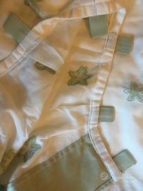 N.2 tende da applicare al vetro tramite paletto con passanti colore verde salvia e bianco. Arricciatura nel mezzo, misura circa m. 100x1,52. Completa di mantovana da applicare al cassonetto m. 2,20x39 cm.