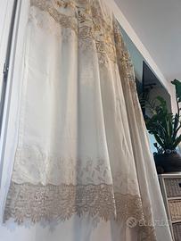 Vendo splendide tende vintage originali degli anni ‘70/‘80, in ottime condizioni. Il tessuto leggero color avorio è arricchito da ricami floreali eleganti e inserti in pizzo lavorato, perfetti per creare un’atmosfera romantica e raffinata.