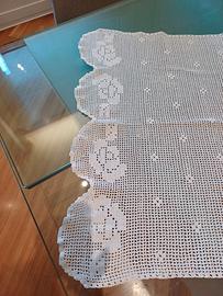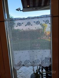 Bellissima tendina lavorata a punto filet con motivo floreale (rose) in cotone bianco (non bianchissimo). Parte inferiore smerlata...