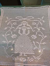 Bellissima tendina in puro cotone color lilla chiarissimo lavorata all'uncinetto punto filet raffigurante una damina contornata da rami fioriti.