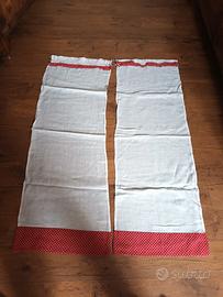 4 Tendine a vetro con voulant a pois bianchi e rosso il fondo una larga 80 cm x175cm lunghezza, altre due 42cm x120 cm di lunghezza usate poco tenute bene