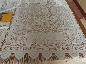 Tendine un telo: 1 beige cm. 240 h x cm. 105; 1 bianca tessuto damasco cm. 210 h x cm. 80; 1 terital burro cm. 215 h x cm. 75 con ricami traforati rombi e fiori. € 10 l'una.