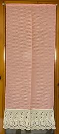Tenda rosa o pois bianchi, decorata in fondo con ampio pizzo Sangallo.