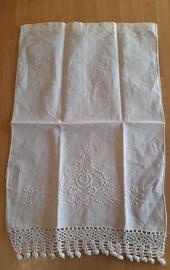 Coppia di tendine bianco avorio coordinate in tela di lino di alta qualità (stile antico/corredo), con un pregiato ricamo floreale e una balza finale in pizzo all'uncinetto con rifinitura a ponpon e nell'altro lato l'orlo classico ripiegato. Misure piccola 55x35 grande 108x70