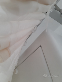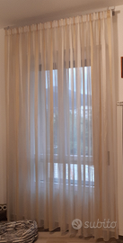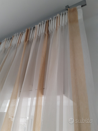 Vendo tendone di organza elegante e trasparente come da foto, fantasia rigata verticale oro e panna su fondo grigio perla chiarissimo, quasi bianco, misure: 5 metri lineari, arricciabili a piacere (in foto riloga da 180 cm ad esempio) per 195 cm di altezza, predisposto per scorrimento a corda o manuale con ganci, in ottime condizioni, confezionato a mano (vendo causa trasloco) a 89 euro!