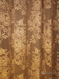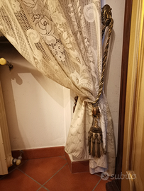 Accetto offerte per questi splendidi tendoni in pizzo di altezza circa 270 cm e larghezza di oltre 170 cm (perché erano utilizzati in una finestra con mantovana larga in totale 170 cm ma sono più larghi perché fanno le pieghe ondulate) completi di cordoni per raccogliere i tendoni lateralmente e mantovana in legno lavorato larga circa 170 cm dotata di chiusure laterali da entrambi i lati, corsie per fissaggio e scorrimento tende, completa di corde e fine corda di legno; ho in coordinato anche le tendine da finestra (misurano circa 137 cm di altezza e 70-80 cm di larghezza perché le usavo per una finestra larga 60 cm ma sono un po' abbondanti visto che fanno le pieghe ondulate classiche delle tendine), ho inoltre altre 2 mantovane uguali, una lunga 195 cm e l'altra 247 cm, entrambe con chiusura laterale solo dal lato destro, in quanto dal lato sinistro terminavano contro il muro. Tutti in condizioni perfette, come nuovi.