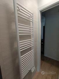 Termoarredo elettrico bianco a fluido 50 cm x 147cmx 10 cm. Ancora imballato vendo per inutilizzo, la foto si riferisce ad un termoarredo installato, quello che vendo doveva essere adibito a secondo bagno, poi trasformato in lavanderia. E perciò initilizzato