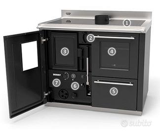 Thermorossi Bosky F30 SQUARE EVO5, termostufa a legna nuova, mai utilizzata, in elegante finitura nera, dotata di forno integrato. Questo modello è la soluzione ideale per chi cerca non solo un sistema di riscaldamento efficiente, ma anche il piacere di cucinare a legna in modo tradizionale. Il forno superiore permette di preparare pane, pizza, arrosti e molto altro, sfruttando il calore naturale della stufa. Dal punto di vista del riscaldamento, la Bosky F30 square evo 5 garantisce ottima resa termica e distribuzione uniforme del calore, risultando perfetta per ambienti medio-grandi. La camera di combustione ampia assicura una buona autonomia, mentre il vetro frontale offre una piacevole visione della fiamma. Prodotto firmato Thermorossi, sinonimo di qualità, affidabilità e lunga durata. Progettata seguendo le recenti normative di sicurezza e costruzione europee, questo prodotto rappresentata la massima tecnologia ottenuta dopo 50 anni di esperienza nella produzione di caldaie e termocucine a legna. Collegata all’impianto idraulico di casa Bosky-F riscalda l’intera abitazione e arreda grazie alle finiture curate, oltre a cucinare nella versione con forno. 1 - Piano cottura in vetro ceramico CERAN® (OPTIONAL) 2 - Flap attivazione e regolazione forno 3 - Focolare (HxLxP-540x290x442) 4 - Forno smaltato completo di griglia e leccarda (HxLxP-320x360x550) 5 - Vano porta legna 6 - Leva di regolazione griglia 7 - Regolatore automatico di tiraggio 8- area riscaldabile 100 m2 Inoltre, il prodotto può accedere agli incentivi del Conto Termico, con possibilità di recuperare una parte significativa della spesa (in base ai requisiti e all’installazione). incentivo fascia F piemonte: 1567,00€ incentivo fascia E piemonte: 1480,42€ PREZZO DI LISTINO: 5735,00 € PREZZO SCONTATO: 4875,00 € SPEDIZIONE 100,00 € CALABRIA E ISOLE 150,00 € CONTRASSEGNO + 1,5% PAYPAL + 3,4% costi di spedizione indicativi, da confermare al momento dell'acquisto. immagini e dati originali thermorossi.