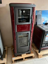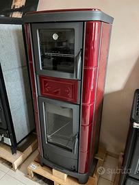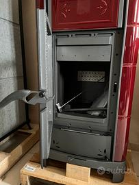 Termostufa ecologica a legna costruita in acciaio di grosso spessore secondo le recenti normative di sicurezza e costruzione europee, rivestimento in ceramica con finiture in rilievo a fiori, potenza utile Kw. 19, grande focolare in ghisa con ampia visione della fiamma, dimensione max focolare HxLxP 480x420x430.