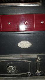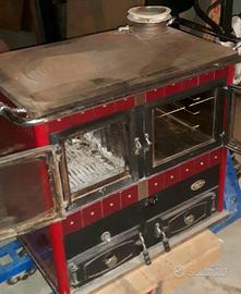 Termostufa a legna "Anselmo Cola" idro con forno laterale e piastra superiore in ghisa riscaldabile. Riscalda circa 120 mq. Rivestimento in bordeaux,come in foto. Perfettamente funzionante.