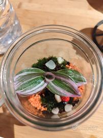 Terrario, mini mondo con pianta Tradescantia zebrina.