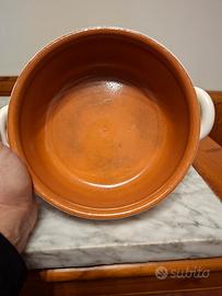Terrina o zuppiera in terracotta, perfetta per servire le tue pietanze. - Interno color arancio brillante. - Esterno bianco decorato con ciliegie. - Manici laterali per una presa sicura. Ideale per zuppe e stufati. Può essere utilizzata direttamente sui fornelli (con spargifiamma), in forno e servita direttamente a tavola.