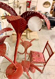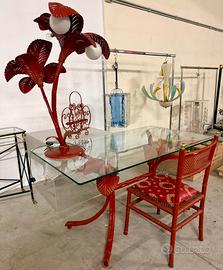 Stupenda parure in ferro battuto di Terzani: scrivania in ferro battuto a fronde di felci , composto da scrivani stessa, lampada da tavolo con tre punti luce , sedia, e porta riviste, di color rosso con pigmentature dorate