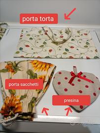 vendo come da foto set cucina 2 porta torta, 1 porta sacchetti,4 presine in cotone fatte a mano! solo se interessati! Non accetto resi!