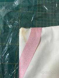 Scampolo tessitura e Candeggio Fratelli Visconti tessuto pelle d'uovo popeline Vintage. Condizioni come da foto, qualche macchia da cassapanca. Tessitura e Candeggio F.lli Visconti di Modrone, è un tessuto pelle d'uovo popeline per cuscini in piuma, è incartato nel cellophane trasparente originale con stemma in carta all'interno. Altezza 80 cm x 6 m ancora confezionato con nastro rosa ed etichetta.